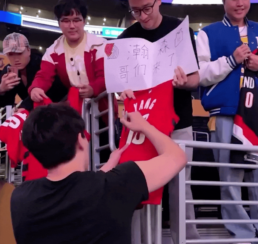开拓者官方更新社交媒体,晒出了赛前杨瀚森在场边为中国球迷们签字,其中有一位球迷高举“瀚森哥们来了”的牌子。